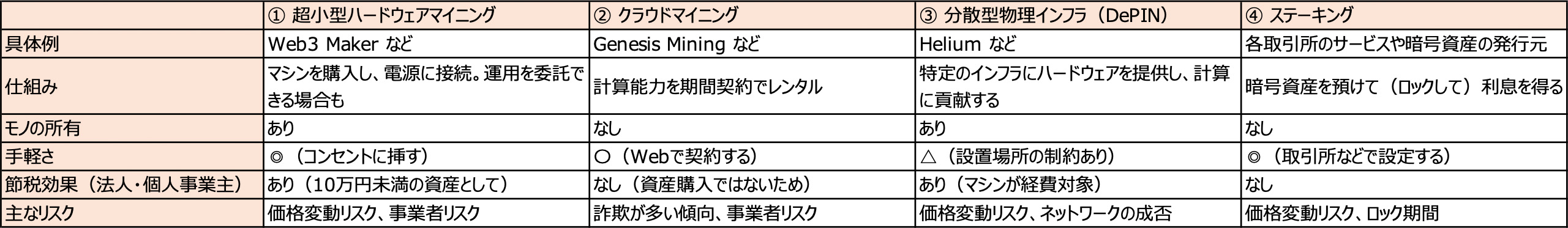 無線ネットワークやデータストレージといった、特定の物理的なインフラを構築・提供するための専用ハードウェアを設置し、そのネットワークへの貢献度に応じて報酬(暗号資産)を得る。マイニングとは異なる形で、現実世界のインフラ構築に参加できる。一方、ハードウェアの調達が必要なので、4つの選択肢の中では一番ハードルが高い。