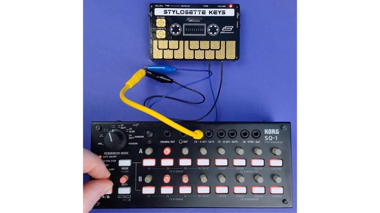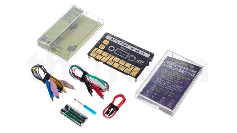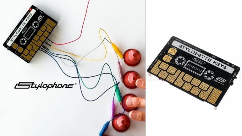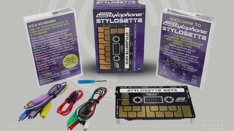 「Stylosette」はカセットテープ型のミニシンセであり、さらに果物や水、スプーン、人の手など、電気を通すものはほぼ何でも、本体につなぐだけで“触れば鳴るキーボード”にできる音楽ガジェットでもある。