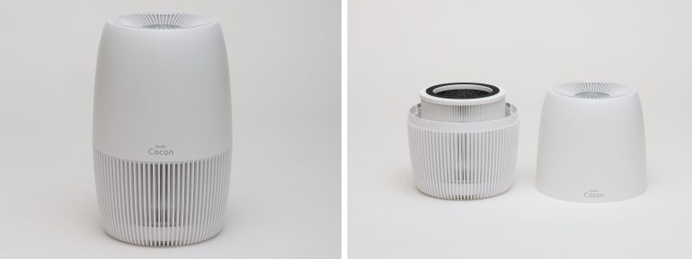 「NuAir cocon」は、約182×182×280 mm、重さ約1.18 kgという軽量コンパクトな空気清浄機。インテリアになじみやすい、ホワイトを基調としたスタイリッシュな筐体を採用する。