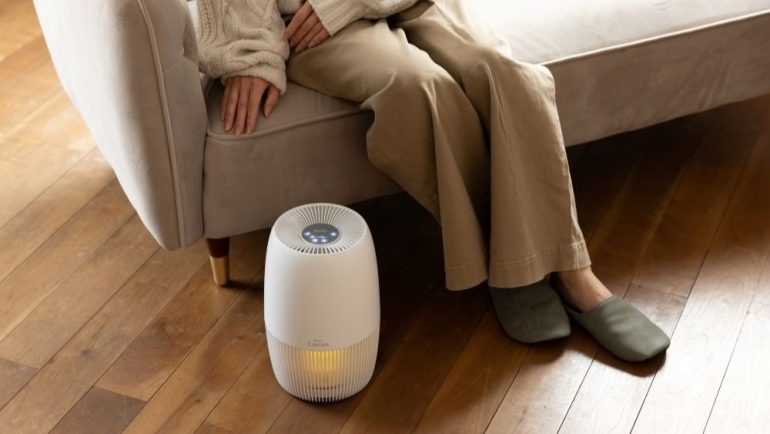 「NuAir cocon」は、約182×182×280 mm、重さ約1.18 kgという軽量コンパクトな空気清浄機。インテリアになじみやすい、ホワイトを基調としたスタイリッシュな筐体を採用する。