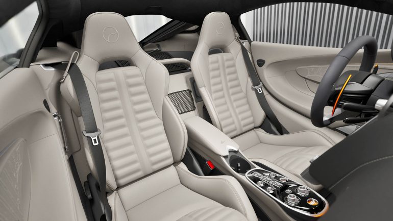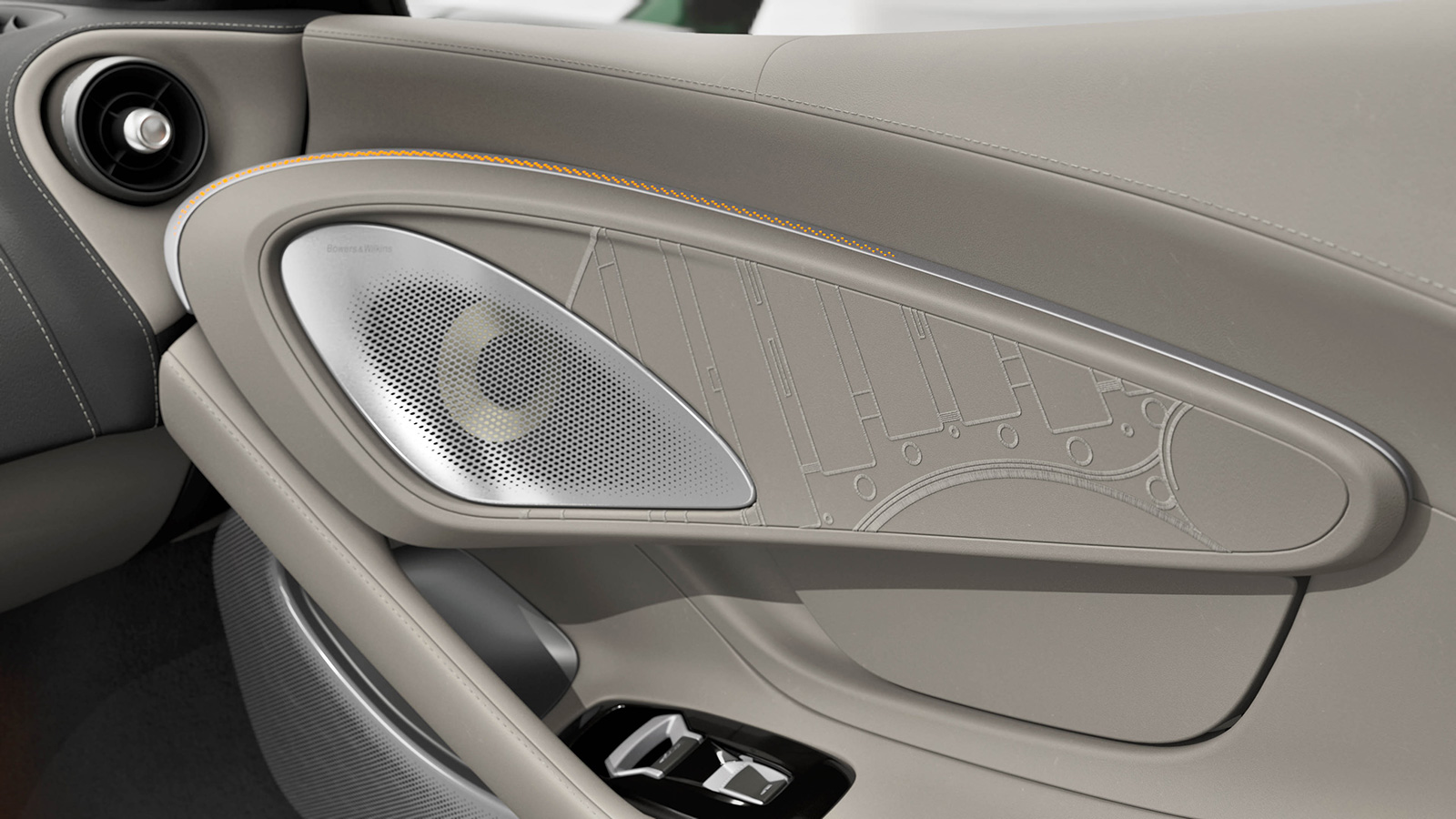 一方インテリアでは、MTCとのつながりをさらに深め、建物デザインから抽出した造形が随所に配される。ヘッドレストには、インフォテイメントボタンにも使用されているMTCロゴが、シート地に馴染むように刺繍されている。助手席側ダッシュボードのフェイシアプレートでは、MTCの側面シルエットがバックライトによって美しく浮かび上がる。ドア内張のフェイシアプレートに目を向けると、MTCの設計図面から俯瞰図の一部を切り取ってデザイン化したものが、同系色のトーナルスティッチとして縫い込まれている。まさにディテールに至るまでマクラーレンの“ホーム”を感じさせる仕上がりとなっている。