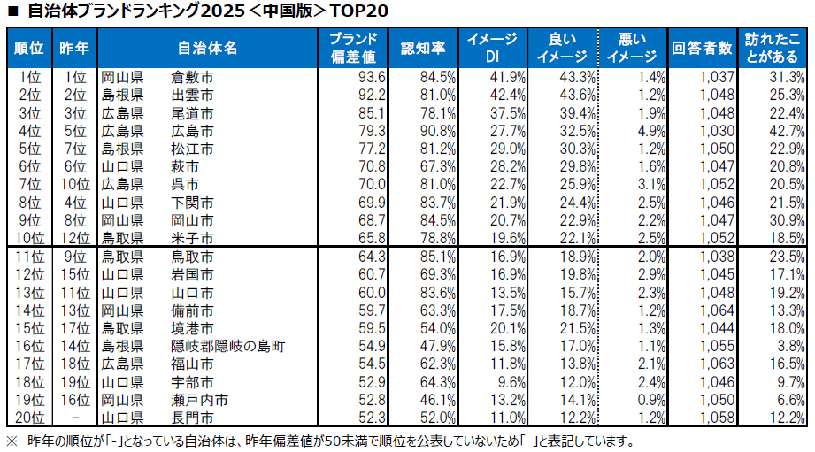 中国地方の「自治体ブランドランキング」のトップスリーは、昨年と同様に1位:岡山県倉敷市、2位:島根県出雲市、3位:広島県尾道市という結果だった。