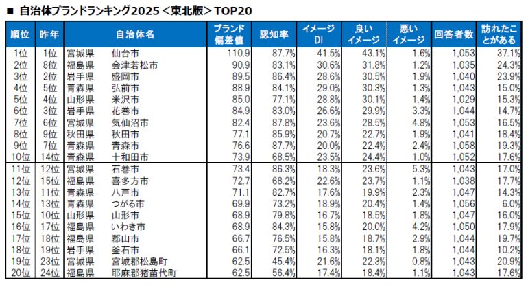 東北地方の「自治体ブランドランキング」のトップスリーは、1位:宮城県仙台市、2位:福島県会津若松市、3位:岩手県盛岡市だった。1位の宮城県仙台市は、東北の中心都市のひとつでブランド偏差値でも2位に大きく差をつけた。2位の福島県会津若松市は、昨年の8位からジャンプアップしており、今後も注目したい自治体だ。