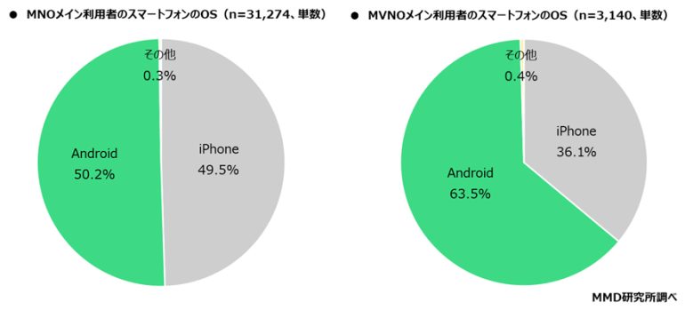 メインで利用しているスマートフォンの機種を把握している3万4868人に、メインで利用しているスマホのOSを質問すると、MNOとMVNOの利用者別では、MNOメイン利用者(n=3万1274)は『iPhone』が49.5%で『Android』が50.2%と拮抗しており、MVNOメイン利用者(n=3140)は『iPhone』が36.1%、『Android』が63.5%とかなりの差があった。MNOブランド別では、『iPhone』はSoftBank(n=3367)がもっとも多く62.8%で、『Android』は楽天モバイル(MNO)(n=3508)が60.1%でもっとも多かった。