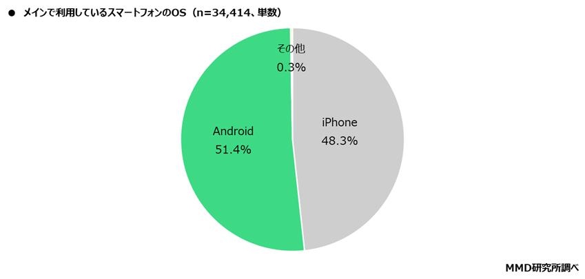 メインで利用しているスマホの機種を把握している3万4414人に、メインで利用するスマホのOSについて質問すると、『iPhone』が48.3%、『Android』が51.4%、「その他」が0.3%だった。2023年からの推移では、『iPhone』は前回調査の2024年(n=3万4868)と比較すると1.3ポイント減少し、『Android』は1.3ポイント増加という結果だった。