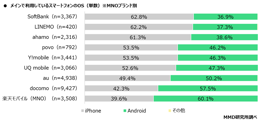 通信サービス別では『iPhone』利用率はSoftBank、『Android』利用率は楽天モバイルがトップ