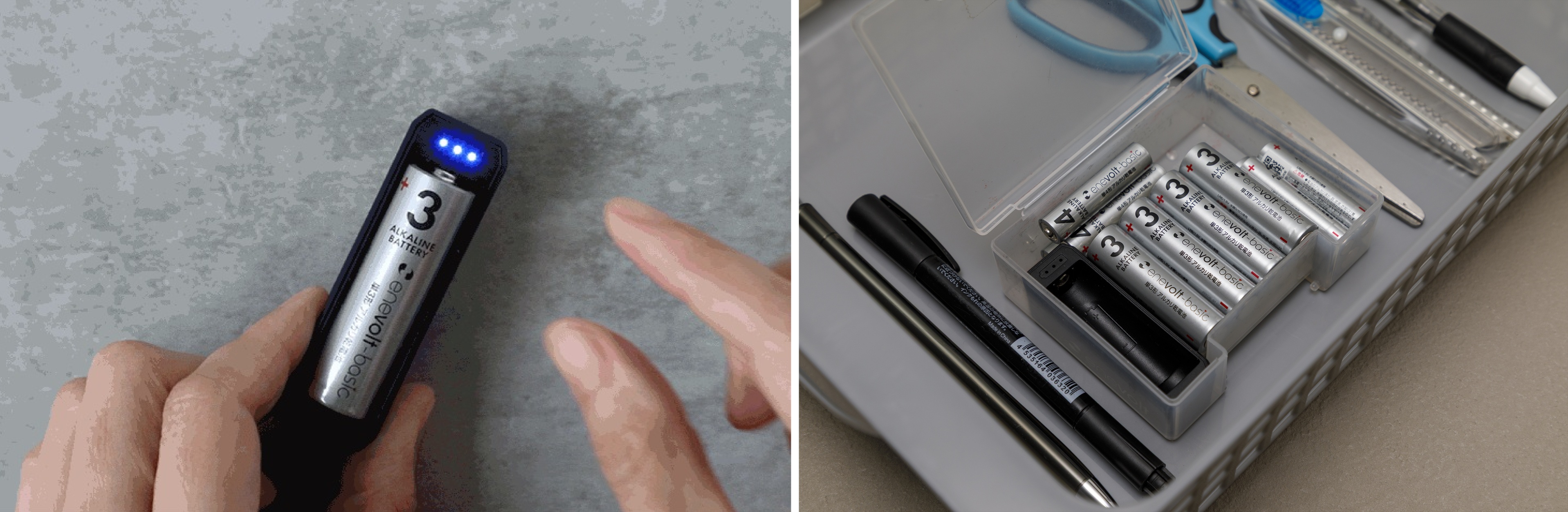 また、「無し/低/中/高」の4段階で電池残量をLED表示するので、ひと目で確認することが可能。さらに、電池と一緒に収納できるコンパクト設計なのも嬉しいポイントだ。