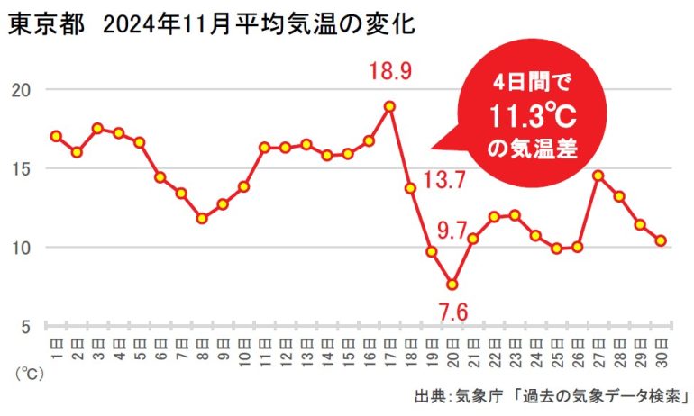 また、2024年11月の日別平均気温を見ると11月17日の18.9℃から翌日は13.7℃と5.2℃下がり、3日後には7.6℃と4日間で11.3℃も下がっている[グラフB]。