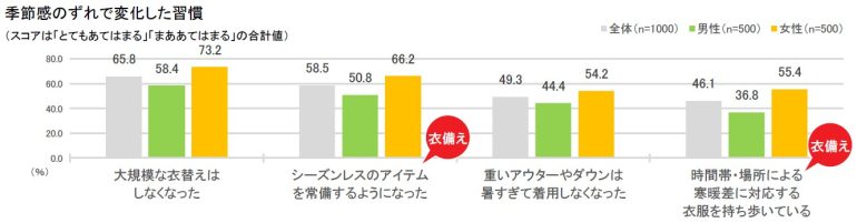 (58.5%)、「時間帯・場所による寒暖差に対応する衣服を持ち歩いている」(46.1%)など、これまでにはなかった衣類習慣が始まっている。男女別に見るといずれも女性のスコアが高くなっている[図9]。