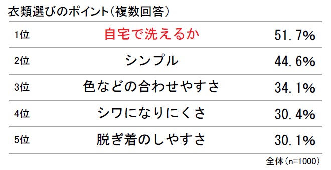 “ネオ四季”により衣類選びが難しくなっている今、どんなことが衣類選びのポイントとなっているか聞いた。すると、「自宅で洗えるか」(51.7%)がトップとなり、次いで「シンプル」(44.6%)、「色などの