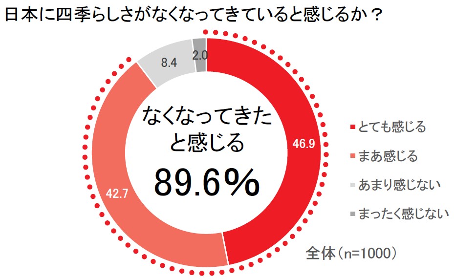 気候の変化や場所・時間による寒暖差などにより、日本に四季らしさがなくなってきていると感じるかと聞くと、46.9%が「とても感じる」、42.7%が「まあ感じる」と答え、全体の89.6%と約9割が四季らしさがなくなってきていると感じている[図1]。