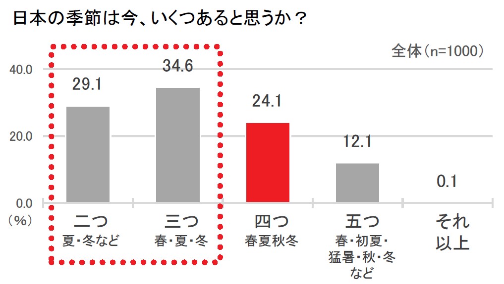 また、日本の季節は今いくつあると思うかと聞くと、本来の春夏秋冬の「四つ」と答えた人は24.1%、夏・冬の「二つ」と答えた人が29.1%、春・夏・冬の「三つ」と答えた人が34.6%となり、四季と答えた人より二季や三季と答えた人のほうが多くなっている[図2]。
