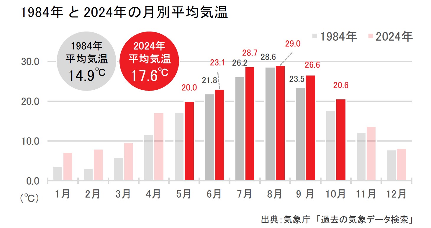 ユニクロ1号店ができた1984年と昨年2024年の東京都の月別平均気温を比較すると、1984年は20℃を超えた月は6月から9月の4カ月であるのに対し、2024年は5月から10月の6カ月と長くなり、年平均気温は1984年14.9℃から2024年17.6℃と、この40年で2.7℃も高くなっている[グラフA]。