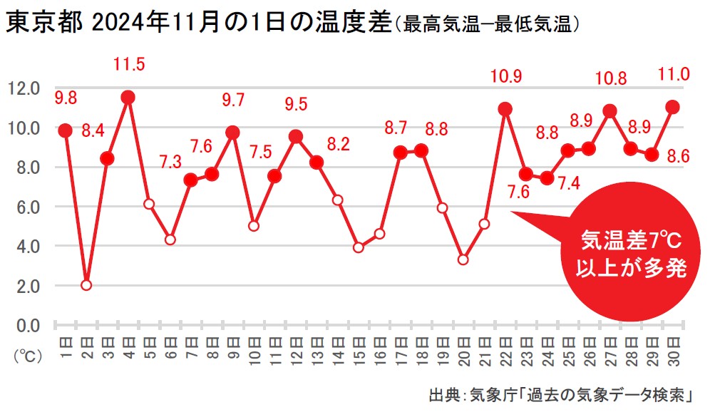 また、2024年11月の日別平均気温を見ると11月17日の18.9℃から翌日は13.7℃と5.2℃下がり、3日後には7.6℃と4日間で11.3℃も下がっている[グラフB]。