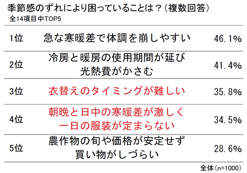 多くの人が“ネオ四季”への移行を実感しているが、季節感のずれにより困っていることを聞くと、1位「急な寒暖差で体調を崩しやすい」(46.1%)、2位「冷房と暖房の使用期間が延び、光熱費がかさむ」(41.4%)に次いで、3位「衣替えのタイミングが難しい」(35.8%)、4位「朝晩と日中の寒暖差が激しく、一日の