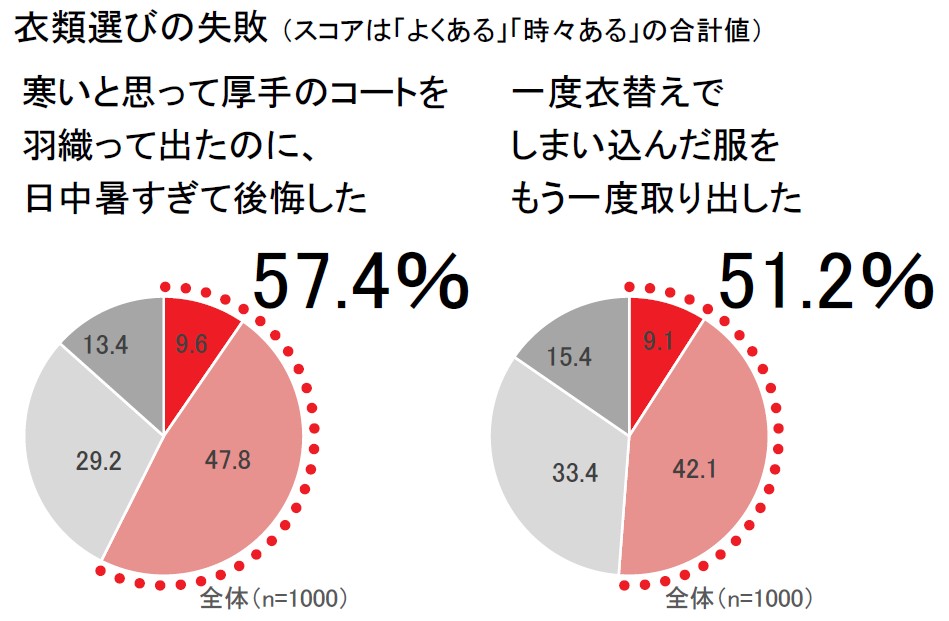 そこで衣類選びで経験したことを聞くと、6割近くが「寒いと思って厚手のコートを羽織って出たのに、日中暑すぎて後悔した」(57.4%)と答え、約半数が「一度衣替えでしまい込んだ服をもう一度取り出した」(51.2%)と答えた[図4]。これまでの四季感覚が通用しなくなっている“ネオ四季”は服選びを難しくしているようだ。