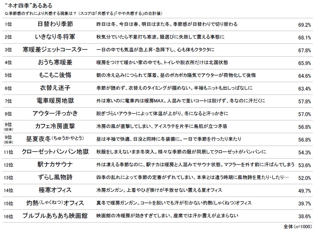 その結果、最も共感度が高かったのは、「昨日は冬、今日は春、明日はまた冬。季節感が日替わりで切り替わる」“日替わり季節”(69.2%)、次いで、「秋気分でいたら不意打ち寒波。服選びに失敗して震える事態に」“いきなり冬将軍”(68.1%)、「一日の中でも気温が急上昇・急降下し、心も体もクタクタに」“寒暖差ジェットコースター”(67.8%)、「暖房をつけて暖かい家の中でも、トイレや脱衣所だけは北国状態」“おうち寒暖差”(65.9%)、「朝の冷え込みにつられて厚着。昼のポカポカ陽気でアウターが荷物化して後悔」“もこもこ後悔”(64.6%)が上位に挙げられた[図5]。