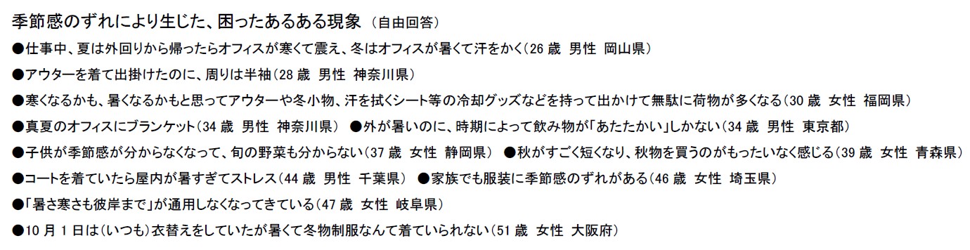 このほか季節感のずれによるあるある現象を寄せてもらうと、「朝・昼・夜、室内・室外で寒さがコロコロ変わり体調が心配」(22歳・女性・大阪府)、「外が寒くてコートを着ているのに、店は暖房効きすぎて暑い」(25歳・男性・長野県)など、さまざまな困った現象が寄せられた[図6]。