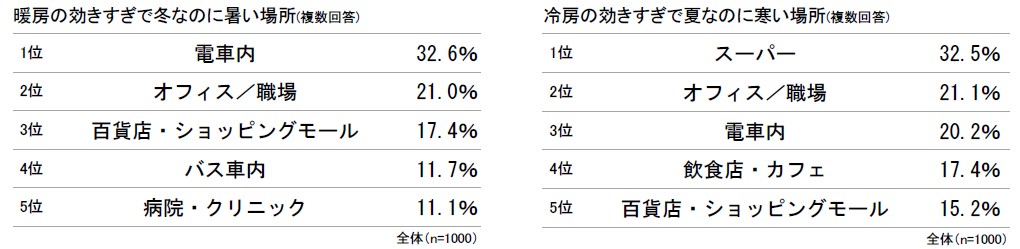 冷暖房で室温ストレスを感じる場所「電車内」「オフィス」「百貨店」は冷暖どちらにもランクイン