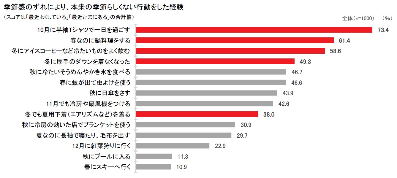季節感のずれにより、本来の季節らしくない行動をした経験を聞いた。すると、「10月に半袖Tシャツで一日を過ごす」(73.4%)、「春なのに鍋料理をする」(61.4%)、「冬にアイスコーヒーなど冷たいものをよく飲む」(58.6%)、「冬に厚手のダウンを着なくなった」(49.3%)が上位に挙げられた。また、「冬でも夏用下着(エアリズムなど)を着る」(38.0%)と答えた人も4割近くいた[図8]。