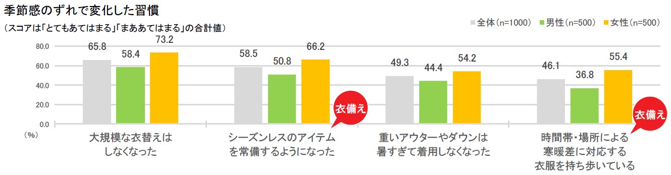 (58.5%)、「時間帯・場所による寒暖差に対応する衣服を持ち歩いている」(46.1%)など、これまでにはなかった衣類習慣が始まっている。男女別に見るといずれも女性のスコアが高くなっている[図9]。