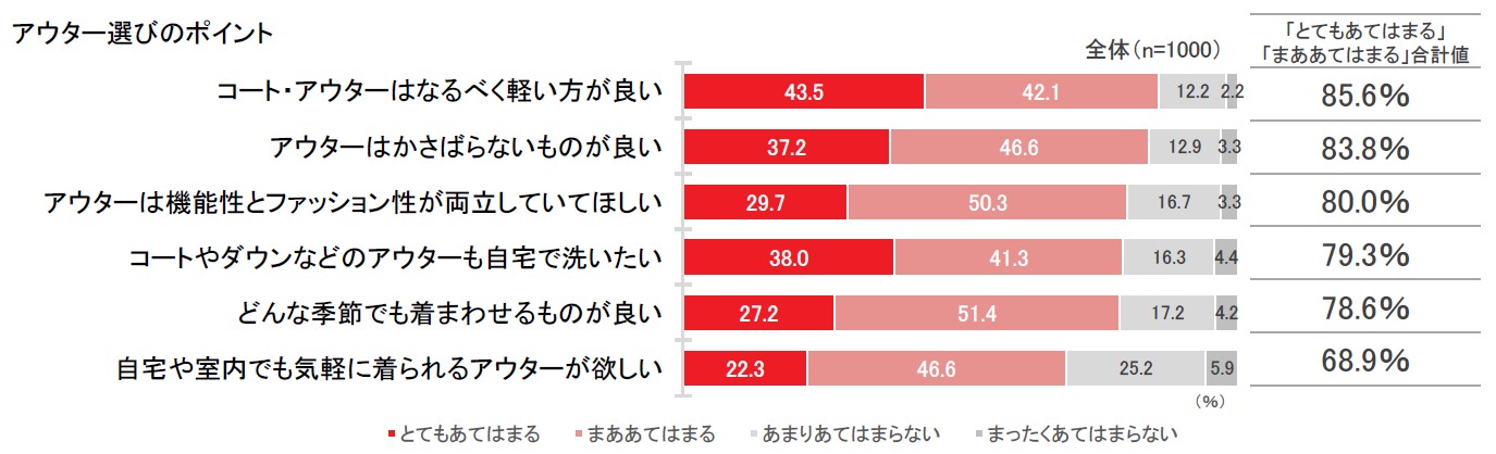 アウター選びに対する考え方を聞くと、「コート・アウターはなるべく軽い方が良い」(85.6%)、「アウターはかさばらないものが良い」(83.8%)、「アウターは機能性とファッション性が両立していてほしい」