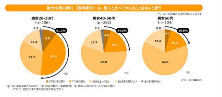「自分の足の疲れ(筋肉疲労)は、他の人と比べて大したことはないと思う」と回答した20~30代は51.3%と過半数に上り、他の世代に比べて足の疲れを軽く見る傾向があることがわかった。