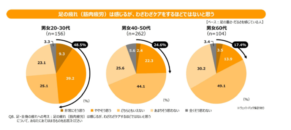 さらに、「足の疲れ(筋肉疲労)は感じるが、わざわざケアするほどではないと思う」と回答した20~30代も48.5%と約半数を占め、他の世代に比べて足の疲れに対する意識の低さが見受けられる。