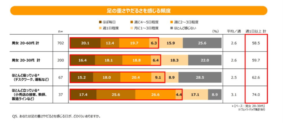 足の重さやだるさを感じる頻度について週1日以上という人は、全世代で58.5%、若年層でも59.7%を占めた[男性20代 60.9%、男性30代 45.8%、女性20代 57.0%、女性30代 71.1%]。