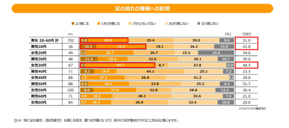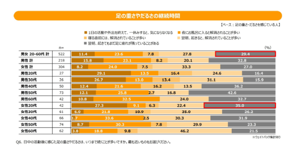しかも、足の重さやだるさは続くことも多く、「翌朝、起きてもまだ足に疲れが残っていることがある」という割合が29.4%となった。