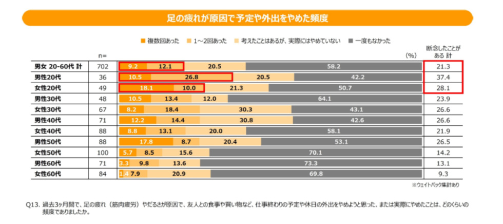 この足の疲れによるQOLへの影響も調べている。過去3ヵ月間に足の疲れが原因で仕事終わりの予定や休日の外出を断念したことがあるかを尋ねたところ、「ある」と回答した人が全世代では21.3%となった。