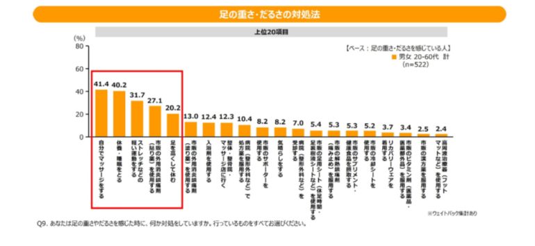 足の重さやだるさを感じたときの対処法では、全世代で見ると最も多いのが「自分でマッサージをする」(41.4%)で、「休養・睡眠をとる」(40.2%)、「ストレッチなどの軽い運動をする」(31.7%)、「市販の外用消炎鎮痛剤(貼り薬)を使用する」(27.1%)、「足を高くして休む」(20.2%)と続いた。