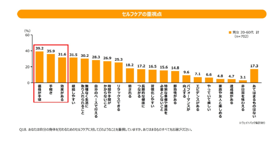 セルフケアを行う上でどのような点を重視しているかについては、全世代で見ると、「価格が手頃」(39.2%)、「手軽さ」(35.9%)、「効果がある」(31.6%)がトップ3となった。若い世代での重視点トップは、男性20代は「習慣化」、男性30代は「パフォーマンスが向上する」、女性20代は「手軽さ」、女性30代は「価格が手頃」であることがわかった。