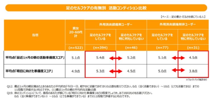 さらに、外用消炎鎮痛剤ユーザーかつ足のセルフケアをしている人のスコアが最も高く、非ユーザーかつ足のセルフケアをしていない人のスコアが最も低いことから、外用消炎鎮痛剤を取り入れて足の疲れに対処すると、日々の活動コンディションに良い影響を与えると考えられる。