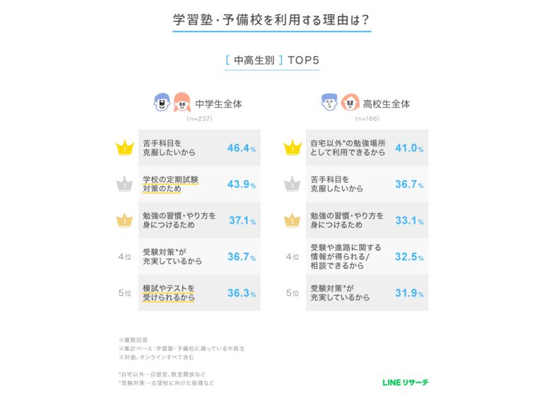 スマートフォン専用のリサーチプラットフォーム「LINEリサーチ」はこのほど、日本全国の中学生・高校生の男女1030名を対象に「塾・予備校など学校外での学習状況や進路」に関する調査を実施し、その結果を発表した。