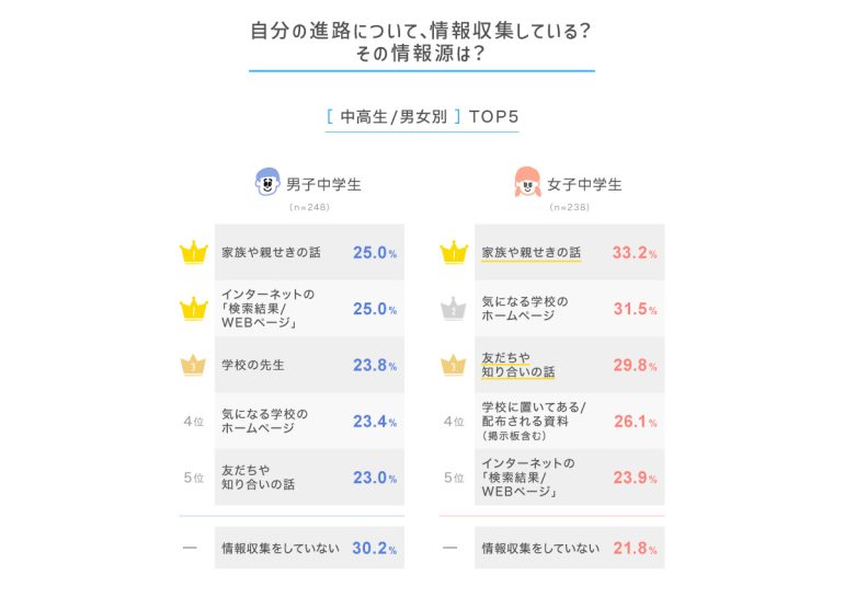 高校生全体では、「情報収集をしていない」が約2割だった。男女ともに1位は「気になる学校のホームページ」で男子高校生は約3割、女子高校生は4割弱と高い割合となった。