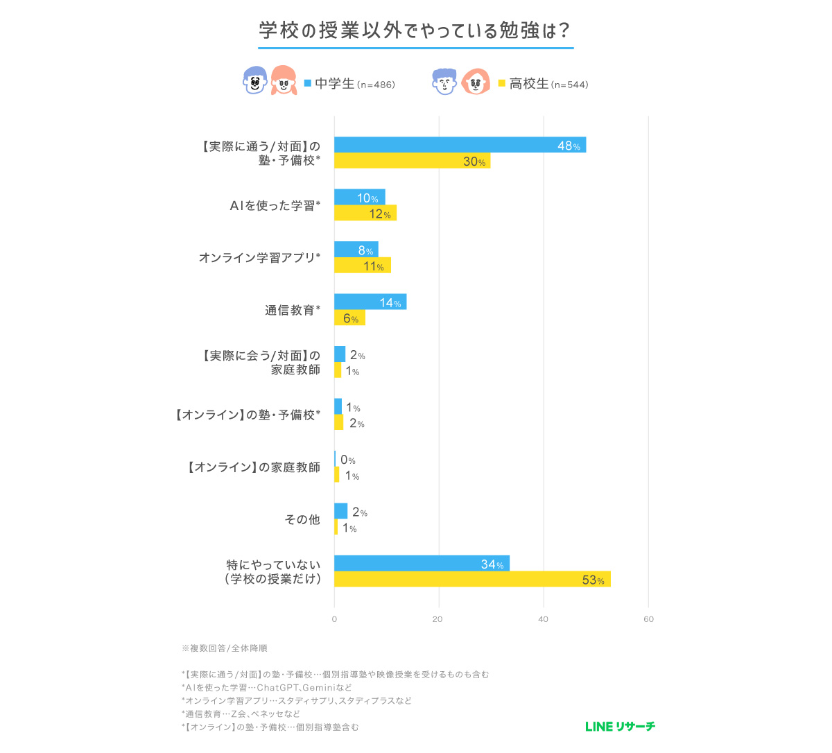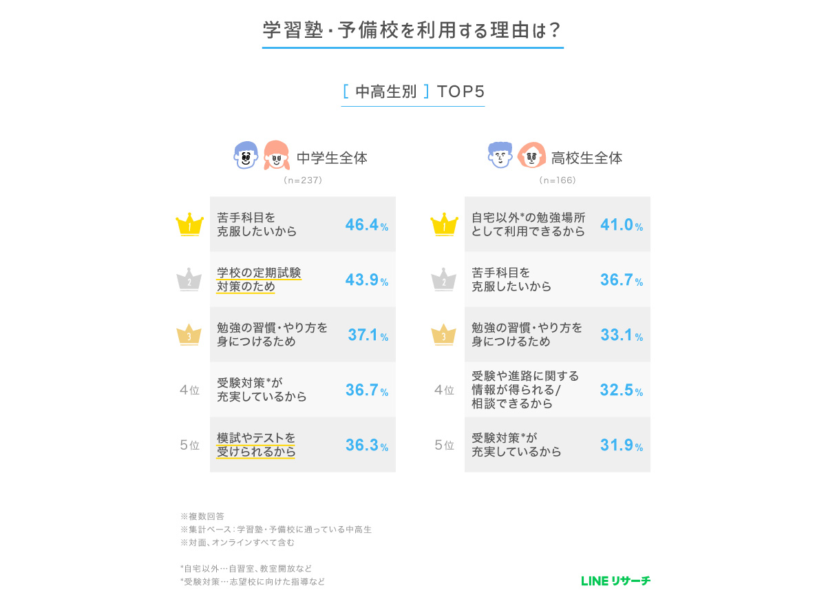 スマートフォン専用のリサーチプラットフォーム「LINEリサーチ」はこのほど、日本全国の中学生・高校生の男女1030名を対象に「塾・予備校など学校外での学習状況や進路」に関する調査を実施し、その結果を発表した。