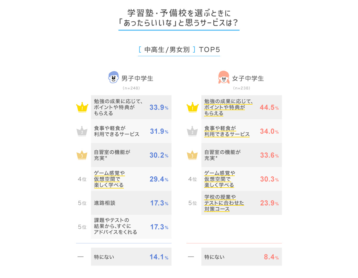 中学生では、男女ともに1位~4位まで同じ項目が並んだ。1位の「勉強の成果に応じて、ポイントや特典がもらえる」は、男子中学生で3割強、特に女子中学生で4割台半ばの高い割合となった。次いで「食事や軽食が利用できるサービス」「自習室の機能が充実」「ゲーム感覚や仮想空間で楽しく学べる」が3割前後で続く。