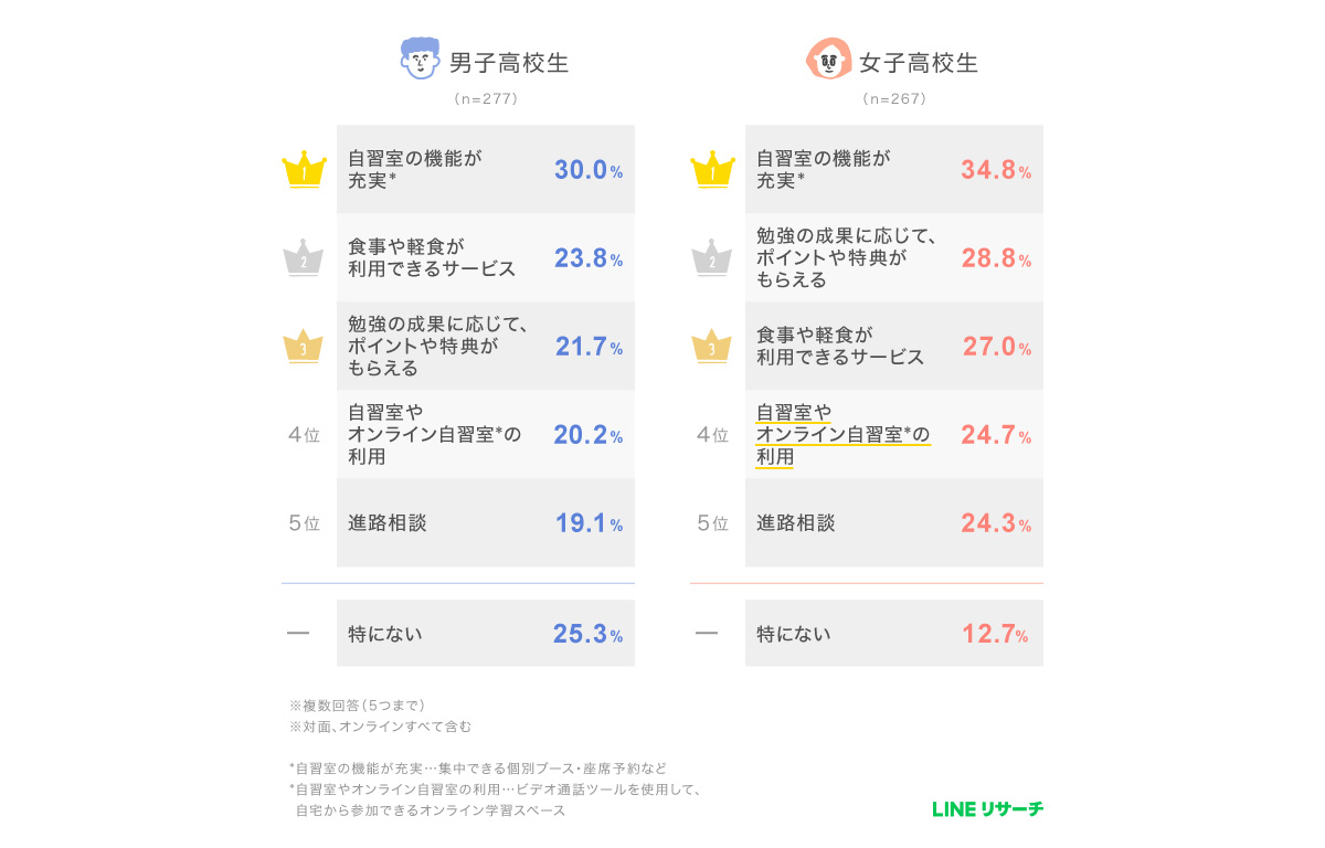 高校生では、「自習室の機能が充実」が3割強で、男女ともに1位。2位以降は順位が異なるものの「食事や軽食が利用できるサービス」「勉強の成果に応じて、ポイントや特典がもらえる」「自習室やオンライン自習室の利用」が2割台で続いた。
