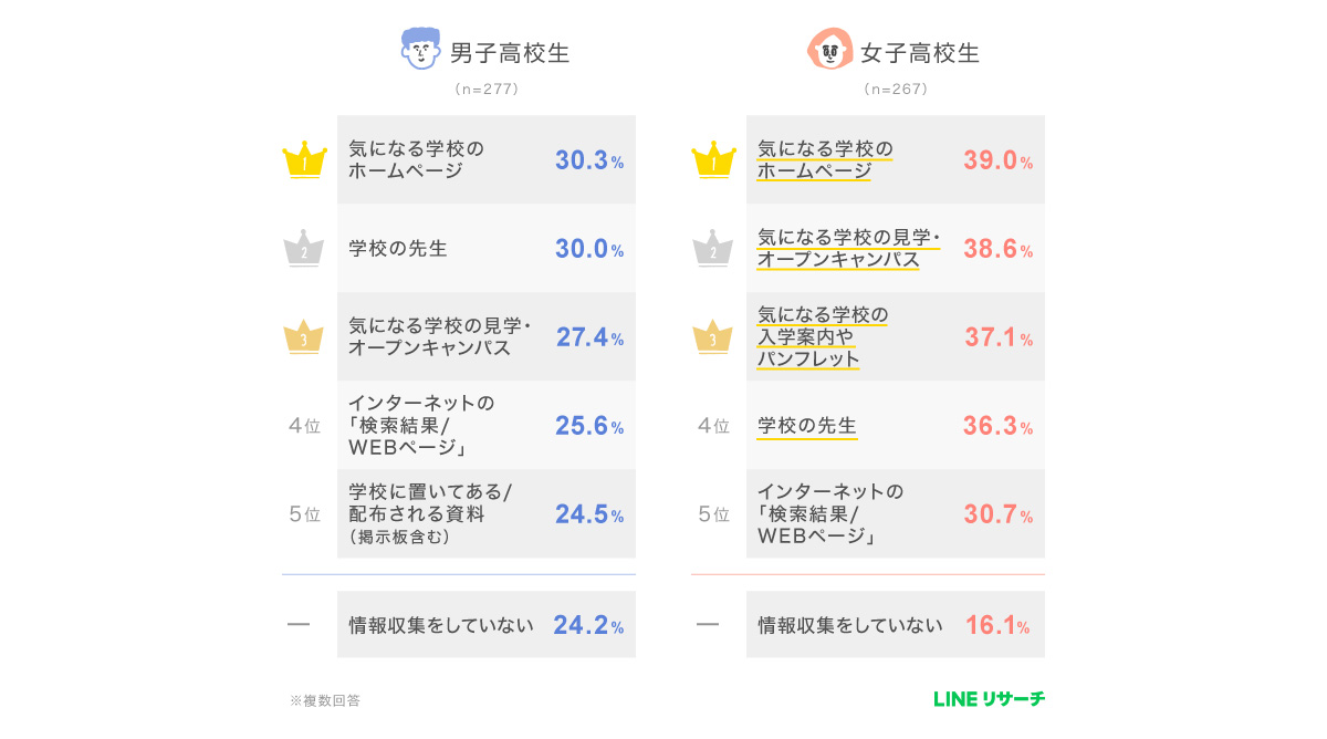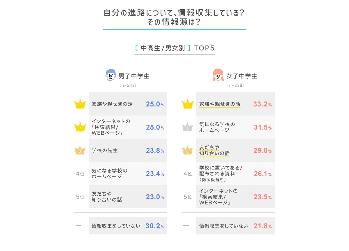 高校生全体では、「情報収集をしていない」が約2割だった。男女ともに1位は「気になる学校のホームページ」で男子高校生は約3割、女子高校生は4割弱と高い割合となった。