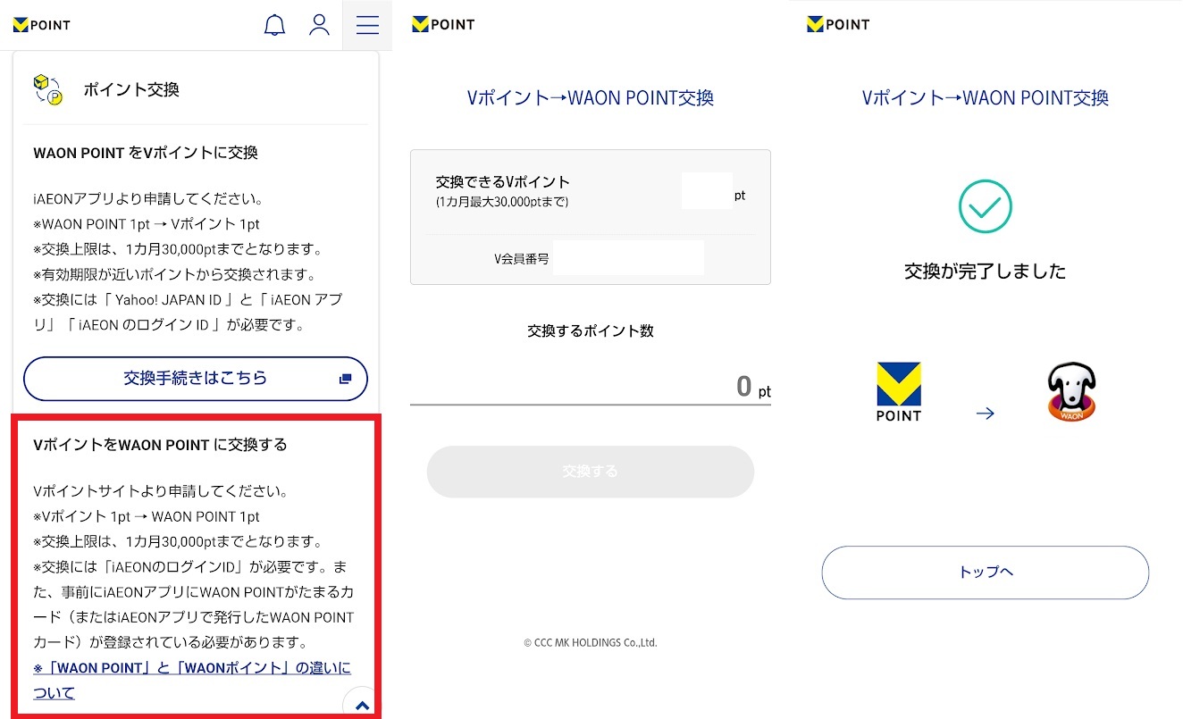 2.VポイントをWAON POINTに交換する(Vポイント1ポイントはWAON POINT1ポイントに換えられる)