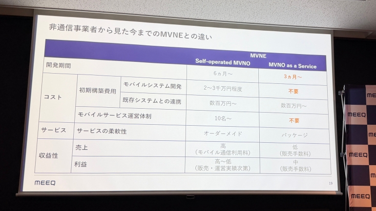 ミークモバイルが新たに提供する「MVNO as a Service」は、MVNEのサービスをパッケージ化しているのが大きな特徴となる。ミークが従来提供しているMVNEサービスでは、総務省への届出や顧客管理のシステム開発などを、MVNO事業者が行う必要があるため、ある程度の知見が求められることが1つのハードルになっている。MVNO事業者が、料金プランの内容を柔軟に設定できるメリットはあるが、サービスの提供開始までに半年ほどの時間を有するのも課題とされている。