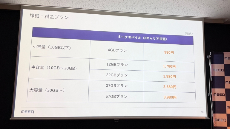 すでにサービス開始当初の料金プランは決まっており、4GB/980円の小容量プランから、57GB/3980円の大容量プランまで、計5つを用意。MVNO事業者によっては、5つのうちからいくつかをピックアップして提供される可能性もある。事務手数料は具体的に公表されていないが、一般的なMVNOと同程度になるとのことだ。
