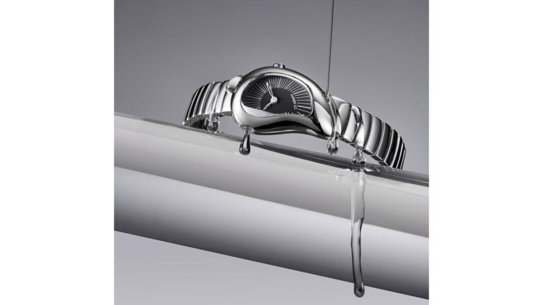 金属が溶けて流れるような質感を追求することで、時計とジュエリーの中間のような有機的シルエットを創出。「時計」と「ブレスレット」の境界を曖昧にしながら、静かに、しかし確実に印象を刻むプロダクトとして完成した。