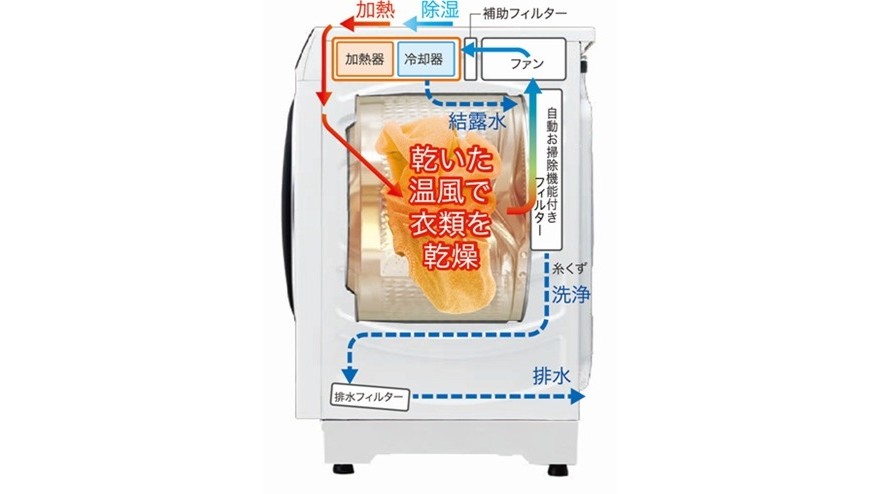 さらに、乾燥方式はヒートポンプ式を採用。ヒートポンプ式はヒーター式と比べて消費電力が半分程度で済むため、電気代を大幅に抑えられるうえ、乾燥時の温度が60~70℃と低いため衣類が傷みにくく、縮みやシワも発生しにくくなるというメリットもある。