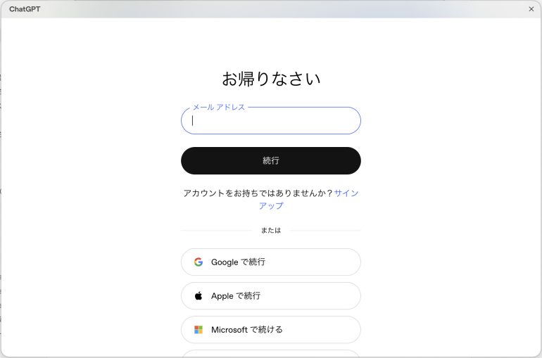 普段、ChatGPTをアプリや他のブラウザから使っていれば、そのアカウントでログインすることができます。無料のアカウントでも利用できるので、ここでログインするか、これまでChatGPTのアカウントを作成したことがなければ新規で登録(サインアップ)しましょう。
