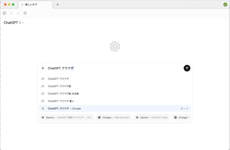 Home画面の入力欄では、通常のChatGPTと同じように、日本語で質問することもできますし、単語を打ち込んでGoogle検索をすることもできます。