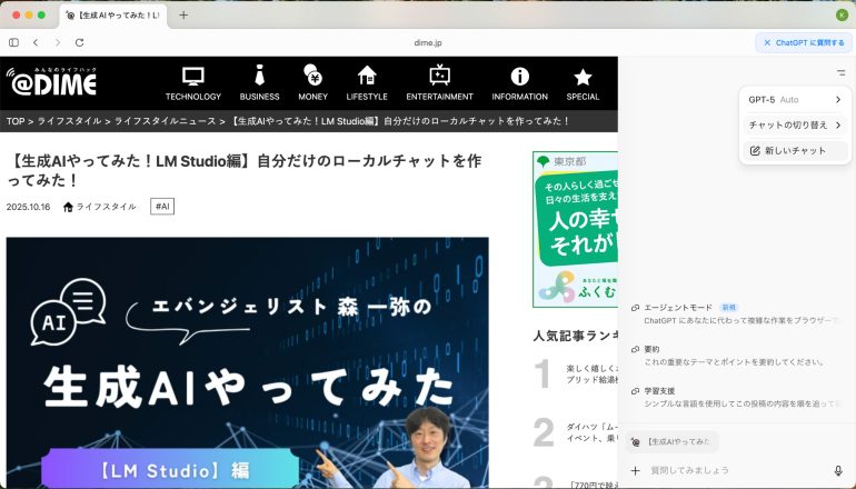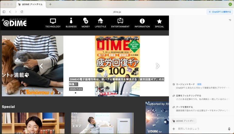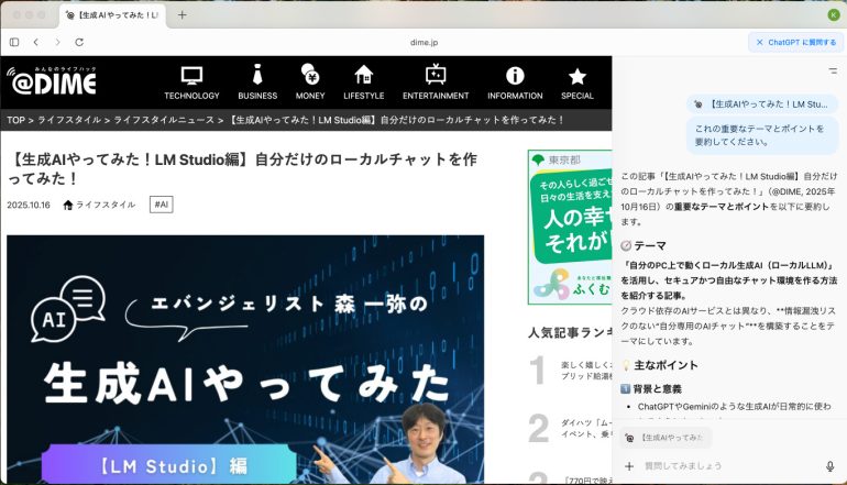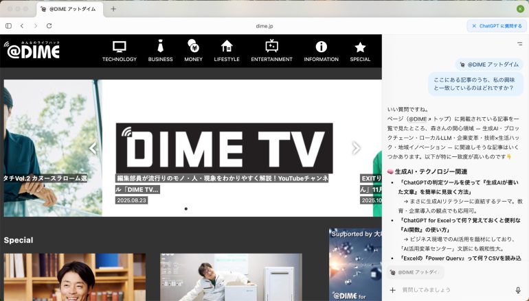 例えば、「@DIME」のページを表示して「ChatGPTに質問する」ボタンを押してみました。