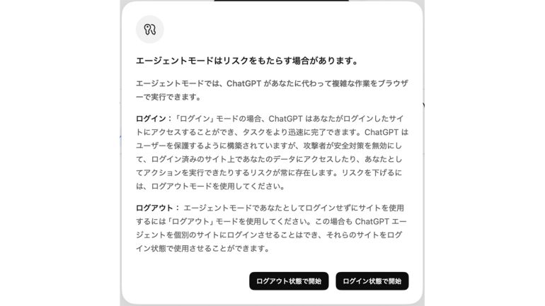 この警告がわかりにくいので補足すると、Googleのスプレッドシートを作成するので、Googleアカウントを使用しないと使えません。Googleアカウントを利用してAtlasにログインしている場合、Atlasがエージェントとしてこのあとの作業を引き継ぐので、そのままログイン状態で進んでいいのか、一旦ログアウトして使うかを聞いています。今回は「ログイン状態で開始」を選んでみました。