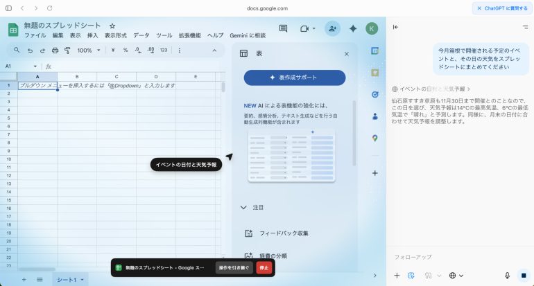 エージェントモードでは、なにやらコメント付きのカーソルが表示されました。「スプレッドシートがかなり得意です」と言ってきたものがありましたので、早速やってもらいましょう。
